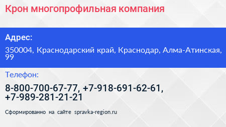 Крон, многопрофильная компания по адресу 350004, Краснодарский край, Краснодар, Алма-Атинская, 99 в дальнейшем Организация, размещена в следующих категориях: