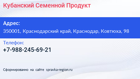 Кубанский Семенной Продукт по адресу 350001, Краснодарский край, Краснодар, Ковтюха, 98 в дальнейшем Организация, размещена в следующих категориях: