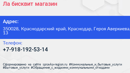 Ла бисквит, магазин по адресу 350028, Краснодарский край, Краснодар, Героя Аверкиева, 13 в дальнейшем Организация, размещена в следующих категориях: