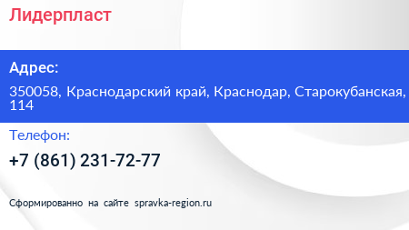 Лидерпласт по адресу 350058, Краснодарский край, Краснодар, Старокубанская, 114 в дальнейшем Организация, размещена в следующих категориях: