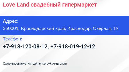 Love Land, свадебный гипермаркет по адресу 350001, Краснодарский край, Краснодар, Озёрная, 19 в дальнейшем Организация, размещена в следующих категориях: