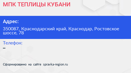 МПК ТЕПЛИЦЫ КУБАНИ по адресу 350087, Краснодарский край, Краснодар, Ростовское шоссе, 78 в дальнейшем Организация, размещена в следующих категориях: