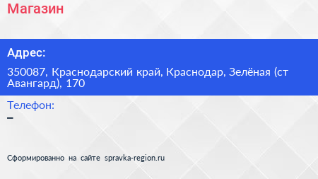 Магазин по адресу 350087, Краснодарский край, Краснодар, Зелёная (ст Авангард), 170 в дальнейшем Организация, размещена в следующих категориях: