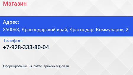 Магазин по адресу 350063, Краснодарский край, Краснодар, Коммунаров, 2 в дальнейшем Организация, размещена в следующих категориях: