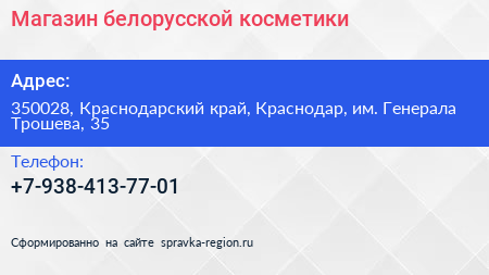 Магазин белорусской косметики по адресу 350028, Краснодарский край, Краснодар, им. Генерала Трошева, 35 в дальнейшем Организация, размещена в следующих категориях: