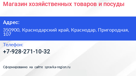 Магазин хозяйственных товаров и посуды по адресу 350900, Краснодарский край, Краснодар, Пригородная, 107 в дальнейшем Организация, размещена в следующих категориях: