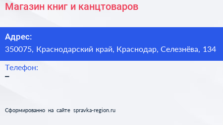 Магазин книг и канцтоваров по адресу 350075, Краснодарский край, Краснодар, Селезнёва, 134 в дальнейшем Организация, размещена в следующих категориях: