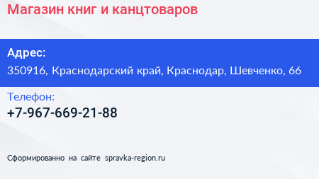 Магазин книг и канцтоваров по адресу 350916, Краснодарский край, Краснодар, Шевченко, 66 в дальнейшем Организация, размещена в следующих категориях: