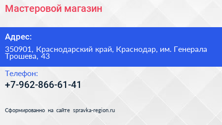 Мастеровой, магазин по адресу 350901, Краснодарский край, Краснодар, им. Генерала Трошева, 43 в дальнейшем Организация, размещена в следующих категориях: