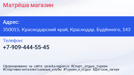 Матрёша, магазин по адресу 350015, Краснодарский край, Краснодар, Будённого, 143 в дальнейшем Организация, размещена в следующих категориях: