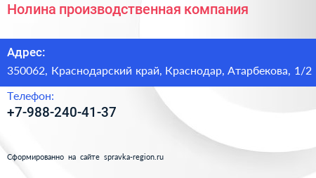 Нолина, производственная компания по адресу 350062, Краснодарский край, Краснодар, Атарбекова, 1/2 в дальнейшем Организация, размещена в следующих категориях: