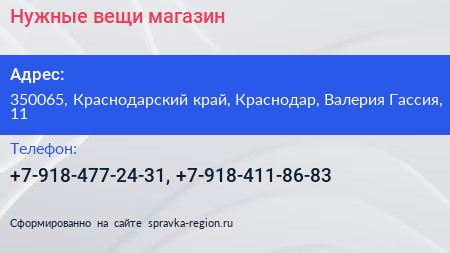 Нужные вещи, магазин по адресу 350065, Краснодарский край, Краснодар, Валерия Гассия, 11 в дальнейшем Организация, размещена в следующих категориях: