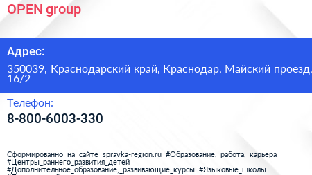 OPEN group по адресу 350039, Краснодарский край, Краснодар, Майский проезд, 16/2 в дальнейшем Организация, размещена в следующих категориях: