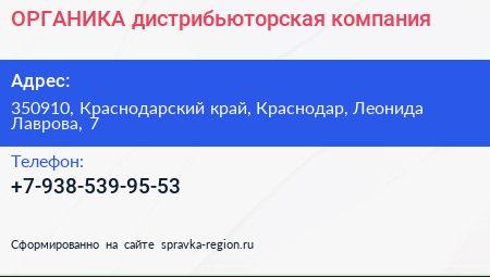 ОРГАНИКА, дистрибьюторская компания по адресу 350910, Краснодарский край, Краснодар, Леонида Лаврова, 7 в дальнейшем Организация, размещена в следующих категориях: