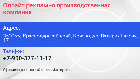 Олрайт, рекламно-производственная компания по адресу 350065, Краснодарский край, Краснодар, Валерия Гассия, 17 в дальнейшем Организация, размещена в следующих категориях:
