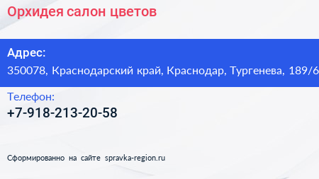Орхидея, салон цветов по адресу 350078, Краснодарский край, Краснодар, Тургенева, 189/6 в дальнейшем Организация, размещена в следующих категориях: