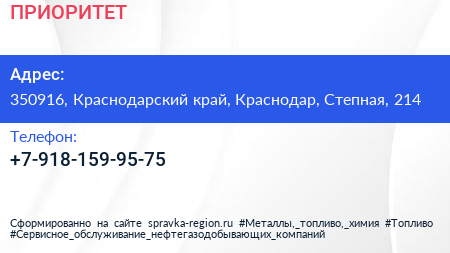 ПРИОРИТЕТ по адресу 350916, Краснодарский край, Краснодар, Степная, 214 в дальнейшем Организация, размещена в следующих категориях: