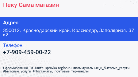 Пеку Сама, магазин по адресу 350012, Краснодарский край, Краснодар, Заполярная, 37 к2 в дальнейшем Организация, размещена в следующих категориях: