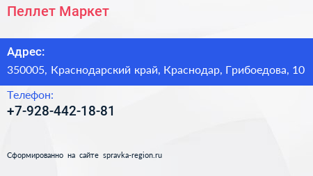 Пеллет Маркет по адресу 350005, Краснодарский край, Краснодар, Грибоедова, 10 в дальнейшем Организация, размещена в следующих категориях: