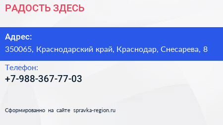 РАДОСТЬ ЗДЕСЬ! по адресу 350065, Краснодарский край, Краснодар, Снесарева, 8 в дальнейшем Организация, размещена в следующих категориях: