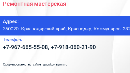 Ремонтная мастерская по адресу 350020, Краснодарский край, Краснодар, Коммунаров, 282 в дальнейшем Организация, размещена в следующих категориях: