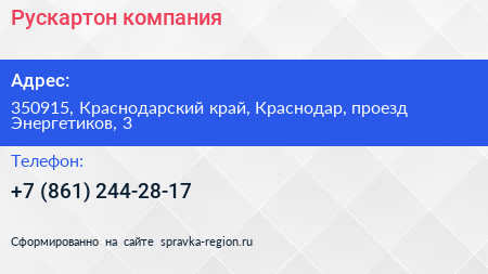 Рускартон, компания по адресу 350915, Краснодарский край, Краснодар, проезд Энергетиков, 3 в дальнейшем Организация, размещена в следующих категориях: