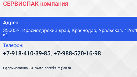 СЕРВИСПАК, компания по адресу 350059, Краснодарский край, Краснодар, Уральская, 126/1 к1 в дальнейшем Организация, размещена в следующих категориях: