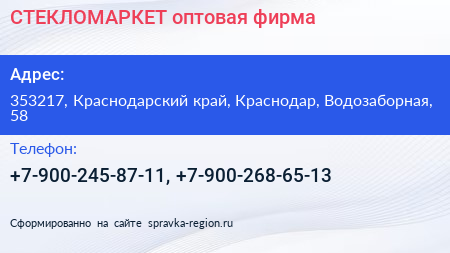 СТЕКЛОМАРКЕТ, оптовая фирма по адресу 353217, Краснодарский край, Краснодар, Водозаборная, 58 в дальнейшем Организация, размещена в следующих категориях: