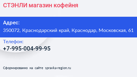 СТЭНЛИ, магазин-кофейня по адресу 350072, Краснодарский край, Краснодар, Московская, 61 в дальнейшем Организация, размещена в следующих категориях: