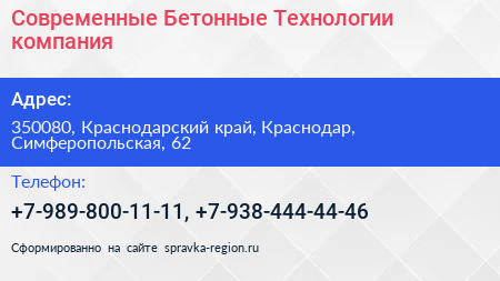 Современные Бетонные Технологии, компания по адресу 350080, Краснодарский край, Краснодар, Симферопольская, 62 в дальнейшем Организация, размещена в следующих категориях: