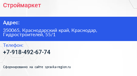 Строймаркет по адресу 350065, Краснодарский край, Краснодар, Гидростроителей, 55/1 в дальнейшем Организация, размещена в следующих категориях: