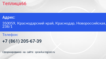 Теплица66 по адресу 350059, Краснодарский край, Краснодар, Новороссийская, 238/1 в дальнейшем Организация, размещена в следующих категориях:
