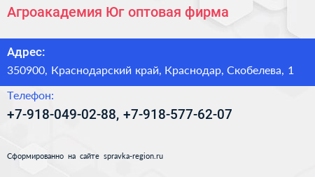 Агроакадемия-Юг, оптовая фирма по адресу 350900, Краснодарский край, Краснодар, Скобелева, 1 в дальнейшем Организация, размещена в следующих категориях: