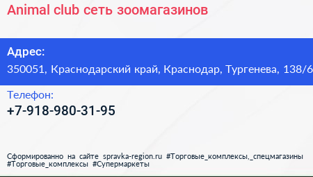 Animal club, сеть зоомагазинов по адресу 350051, Краснодарский край, Краснодар, Тургенева, 138/6 в дальнейшем Организация, размещена в следующих категориях: