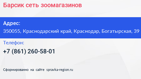 Барсик, сеть зоомагазинов по адресу 350055, Краснодарский край, Краснодар, Богатырская, 39 в дальнейшем Организация, размещена в следующих категориях: