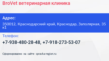 BroVet, ветеринарная клиника по адресу 350012, Краснодарский край, Краснодар, Заполярная, 35 к1 в дальнейшем Организация, размещена в следующих категориях: