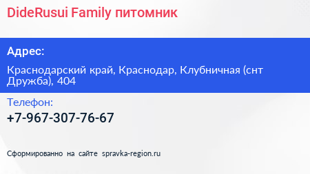 DideRusui Family, питомник по адресу Краснодарский край, Краснодар, Клубничная (снт Дружба), 404 в дальнейшем Организация, размещена в следующих категориях: