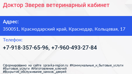 Доктор Зверев, ветеринарный кабинет по адресу 350051, Краснодарский край, Краснодар, Кольцевая, 17 в дальнейшем Организация, размещена в следующих категориях: