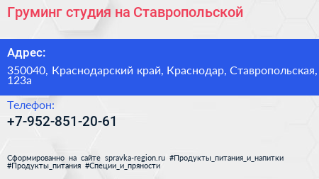Груминг-студия на Ставропольской по адресу 350040, Краснодарский край, Краснодар, Ставропольская, 123а в дальнейшем Организация, размещена в следующих категориях: