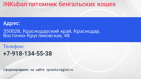 INKuban, питомник бенгальских кошек по адресу 350028, Краснодарский край, Краснодар, Восточно-Кругликовская, 48 в дальнейшем Организация, размещена в следующих категориях: