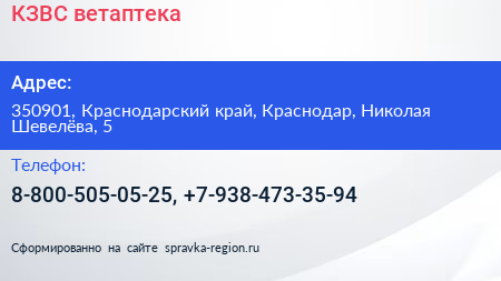 КЗВС, ветаптека по адресу 350901, Краснодарский край, Краснодар, Николая Шевелёва, 5 в дальнейшем Организация, размещена в следующих категориях: