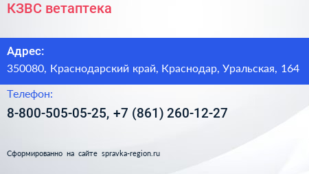 КЗВС, ветаптека по адресу 350080, Краснодарский край, Краснодар, Уральская, 164 в дальнейшем Организация, размещена в следующих категориях:
