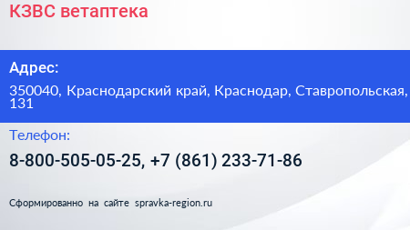 КЗВС, ветаптека по адресу 350040, Краснодарский край, Краснодар, Ставропольская, 131 в дальнейшем Организация, размещена в следующих категориях: