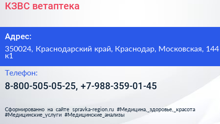 КЗВС, ветаптека по адресу 350024, Краснодарский край, Краснодар, Московская, 144 к1 в дальнейшем Организация, размещена в следующих категориях:
