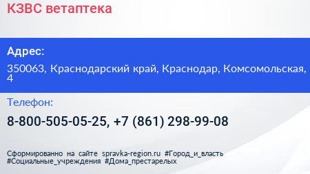КЗВС, ветаптека по адресу 350063, Краснодарский край, Краснодар, Комсомольская, 4 в дальнейшем Организация, размещена в следующих категориях:
