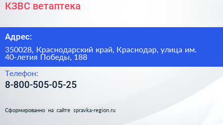 КЗВС, ветаптека по адресу 350028, Краснодарский край, Краснодар, улица им. 40-летия Победы, 188 в дальнейшем Организация, размещена в следующих категориях: