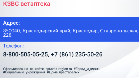КЗВС, ветаптека по адресу 350040, Краснодарский край, Краснодар, Ставропольская, 228 в дальнейшем Организация, размещена в следующих категориях: