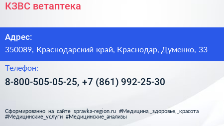КЗВС, ветаптека по адресу 350089, Краснодарский край, Краснодар, Думенко, 33 в дальнейшем Организация, размещена в следующих категориях:
