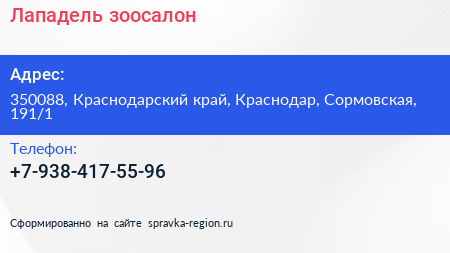 Лападель, зоосалон по адресу 350088, Краснодарский край, Краснодар, Сормовская, 191/1 в дальнейшем Организация, размещена в следующих категориях: