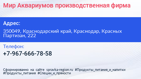 Мир Аквариумов, производственная фирма по адресу 350049, Краснодарский край, Краснодар, Красных Партизан, 222 в дальнейшем Организация, размещена в следующих категориях: